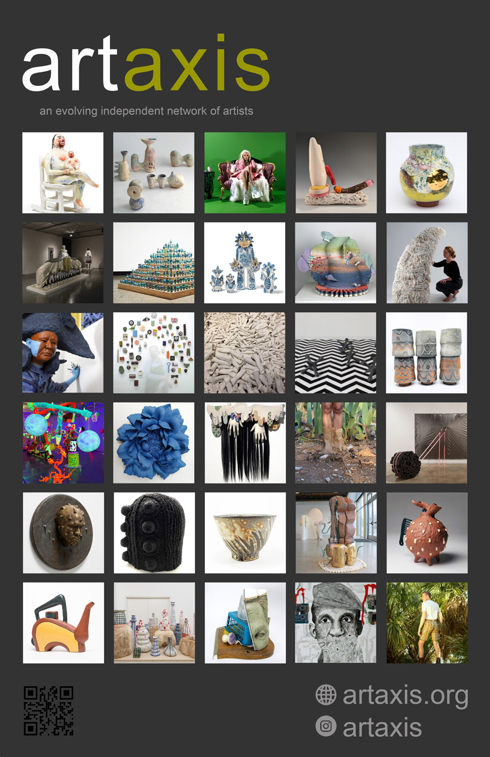 The Artaxis poster design for the 2022 NCECA conference features a broad cross section of artwork representing Artaxis members from around the world.