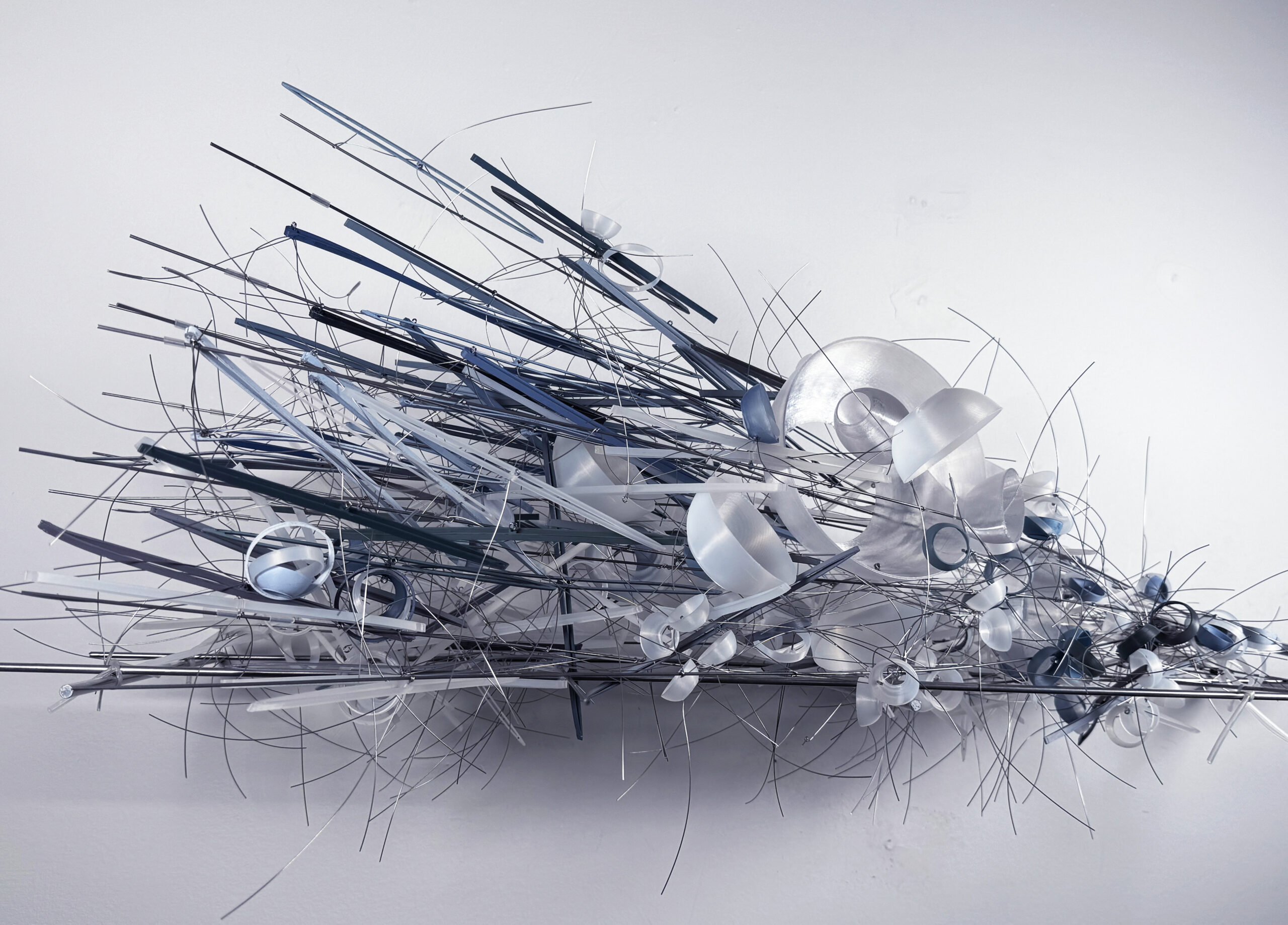 Geometry and light sensitive materials become an aesthetic and structural language for sharing my ideas. My sculpture feels like a woven landscape. Color and form appear to be weightless. Energy flows as objects spring to life, fully formed. I imagine each piece as an intimate universe, bound together by positive attraction. Temporal moments are scattered and gathered, a tuning process of chroma, form and spatial frequencies.
