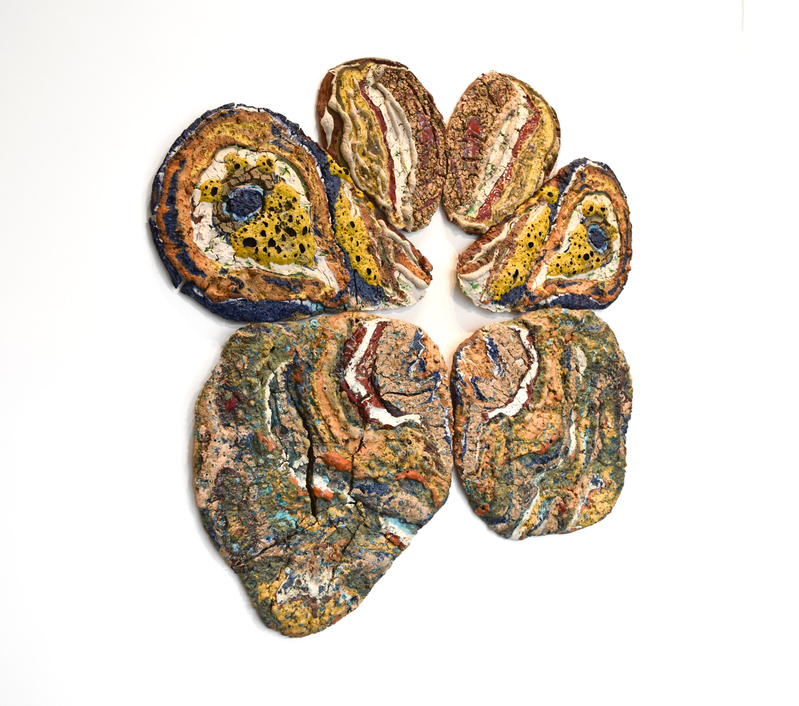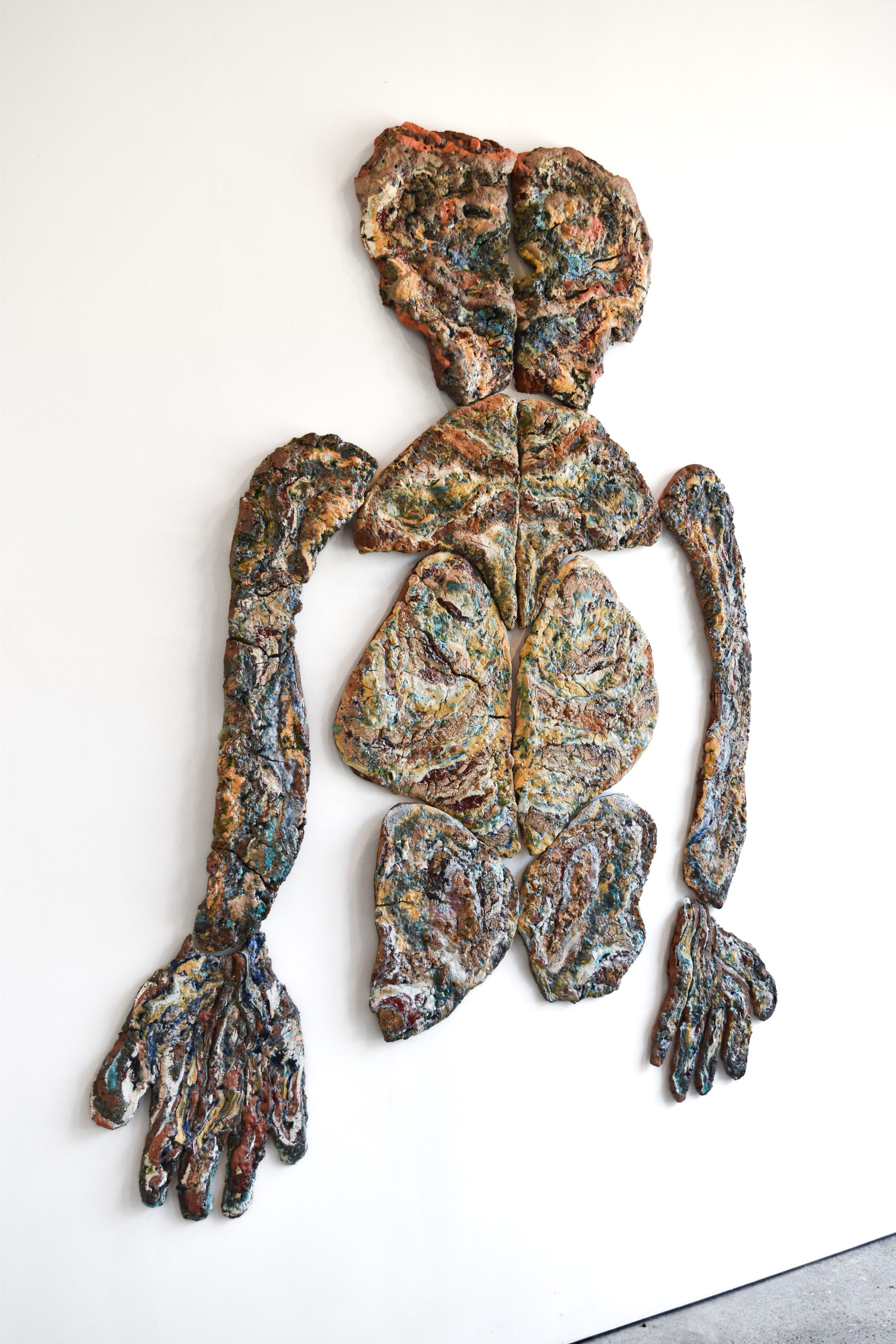 Earthlings Installation, ADS Gallery. Newburgh, NY 2024 “Butterfly”, 41" x 40" x 1" Native and colored clay, glaze, glass, crushed rocks, perlite, 2024 "Figure", 24" x 16" x 1" Native and colored clay, glaze, glass, crushed rocks, perlite, 2024 “Earthling”, 79" x 60" x 2" , Native and colored clay, glaze, glass, crushed rocks, perlite, 2024