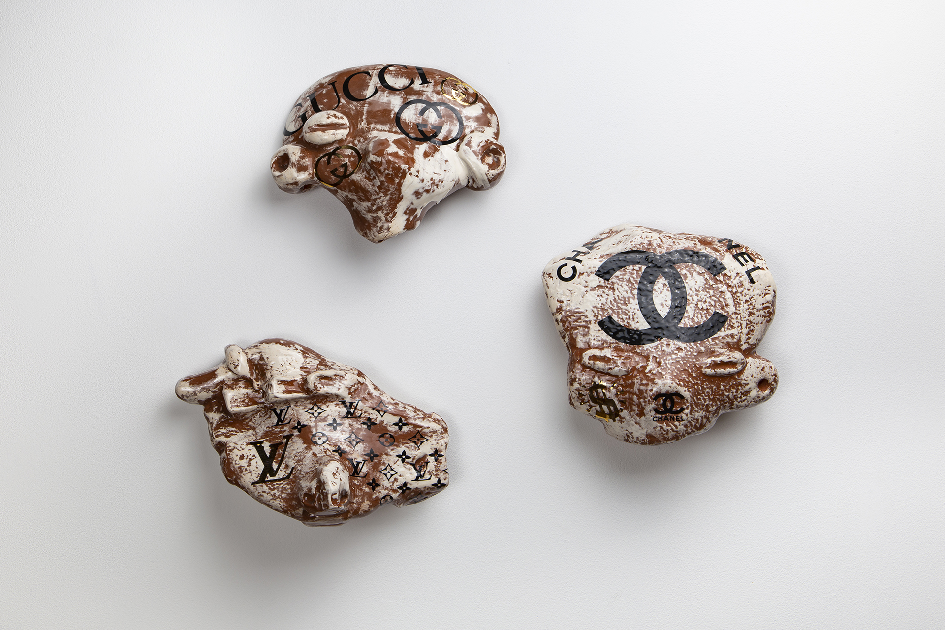 2019, dimensions variable, each head is approximately 16 X 4 X 18, Media: Stoneware, Firing Process: Electric, Surface: Glazed, Image transfer / Decals / Screenprint, Lustre