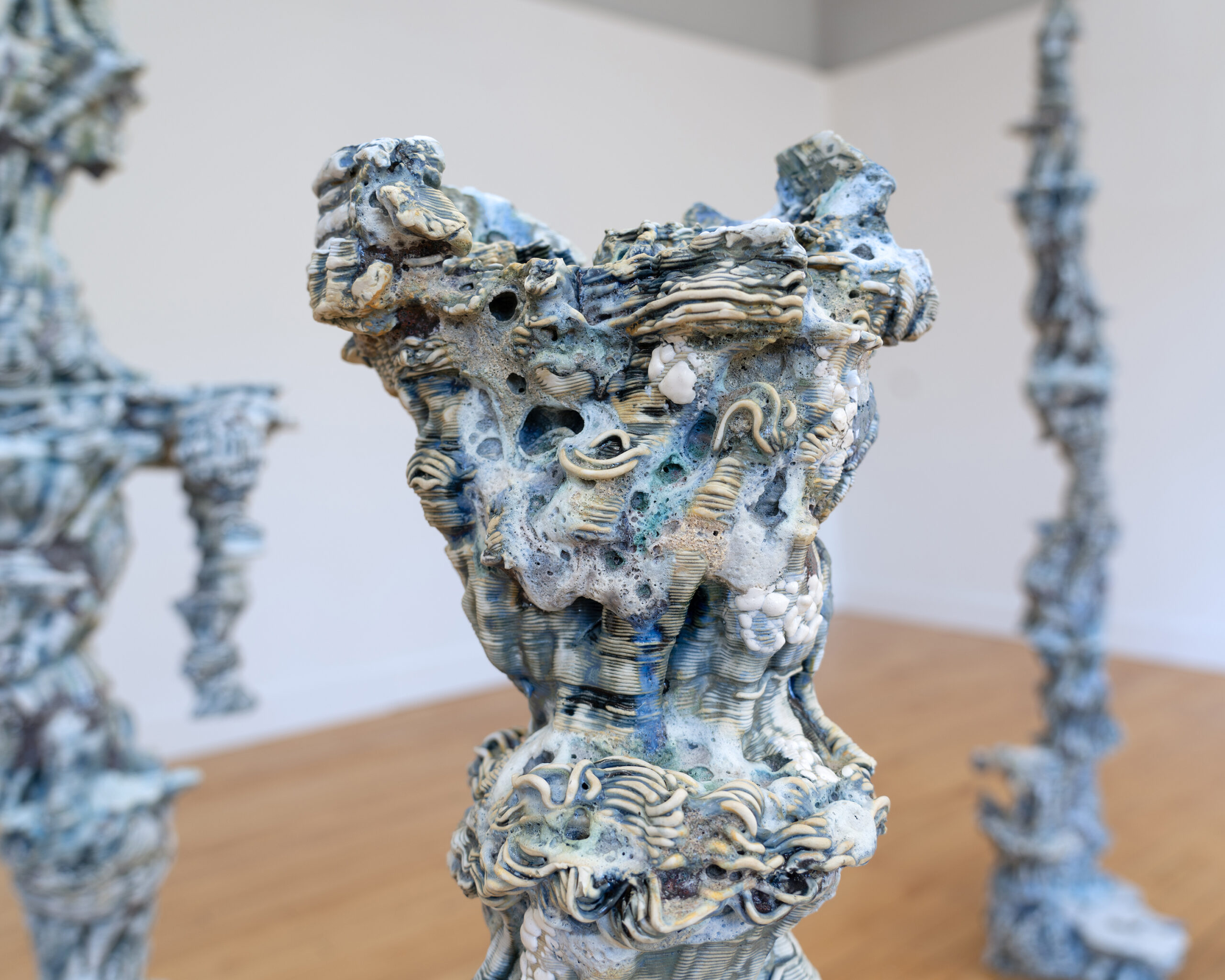 Material plays a crucial role in this exploration. I’m drawn to raw materials like clay and plaster that inherently shift states and have limitless potential to morph and change. I often generate many individual parts and experiment with different combinations and configurations. This process of reconfiguring and constructing larger wholes from smaller, mutable components mirrors the flux and interdependence found in living systems.