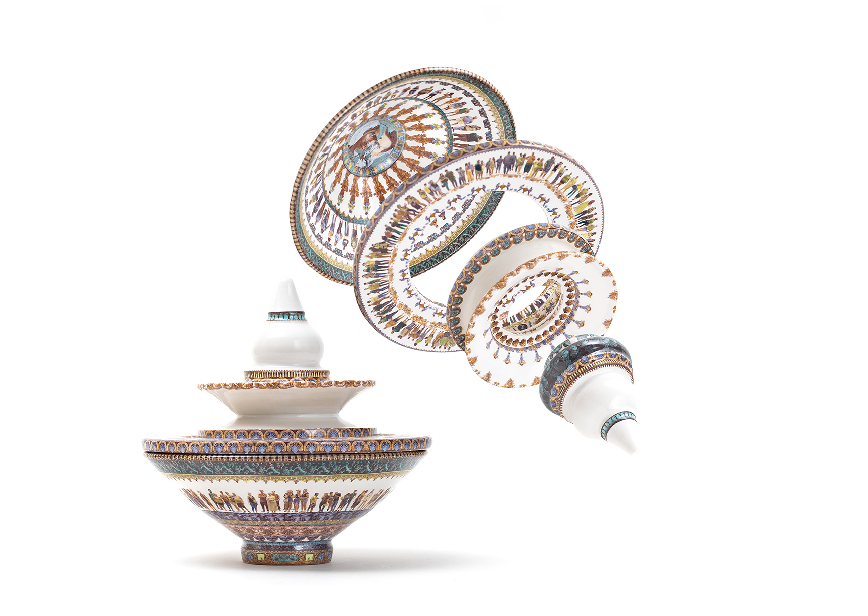 Bands of imagery spin around the thrown and assembled ceramic garnitures creating a feeling that time is passing, people are revealing themselves, and a story is being told. The meaning is not immediately clear, giving each piece an air of mystery confined within the daily lives of the subjects and Olson’s choice of cultural and religious objects, which form the background patterns for each piece.