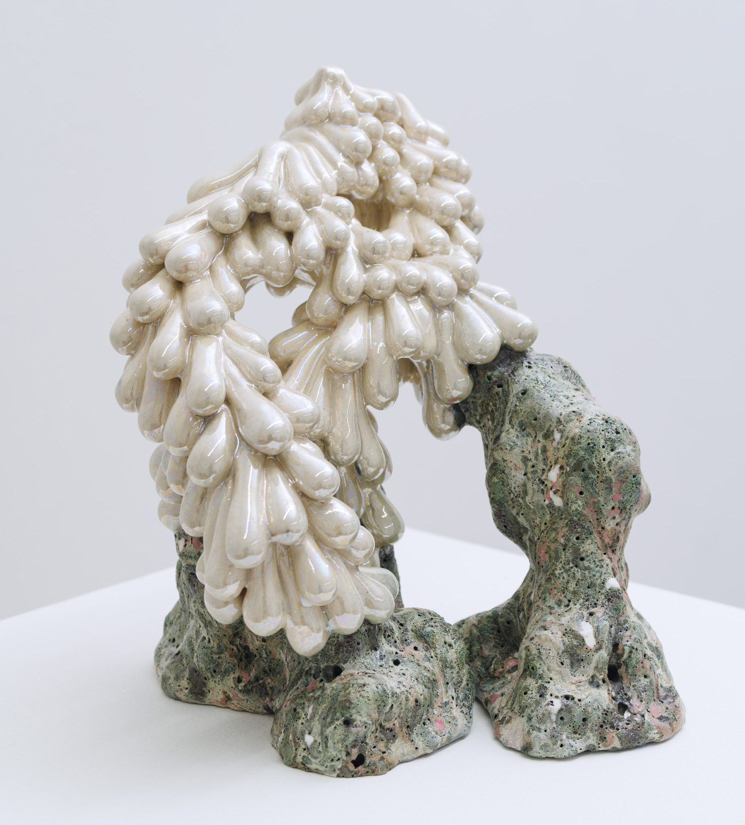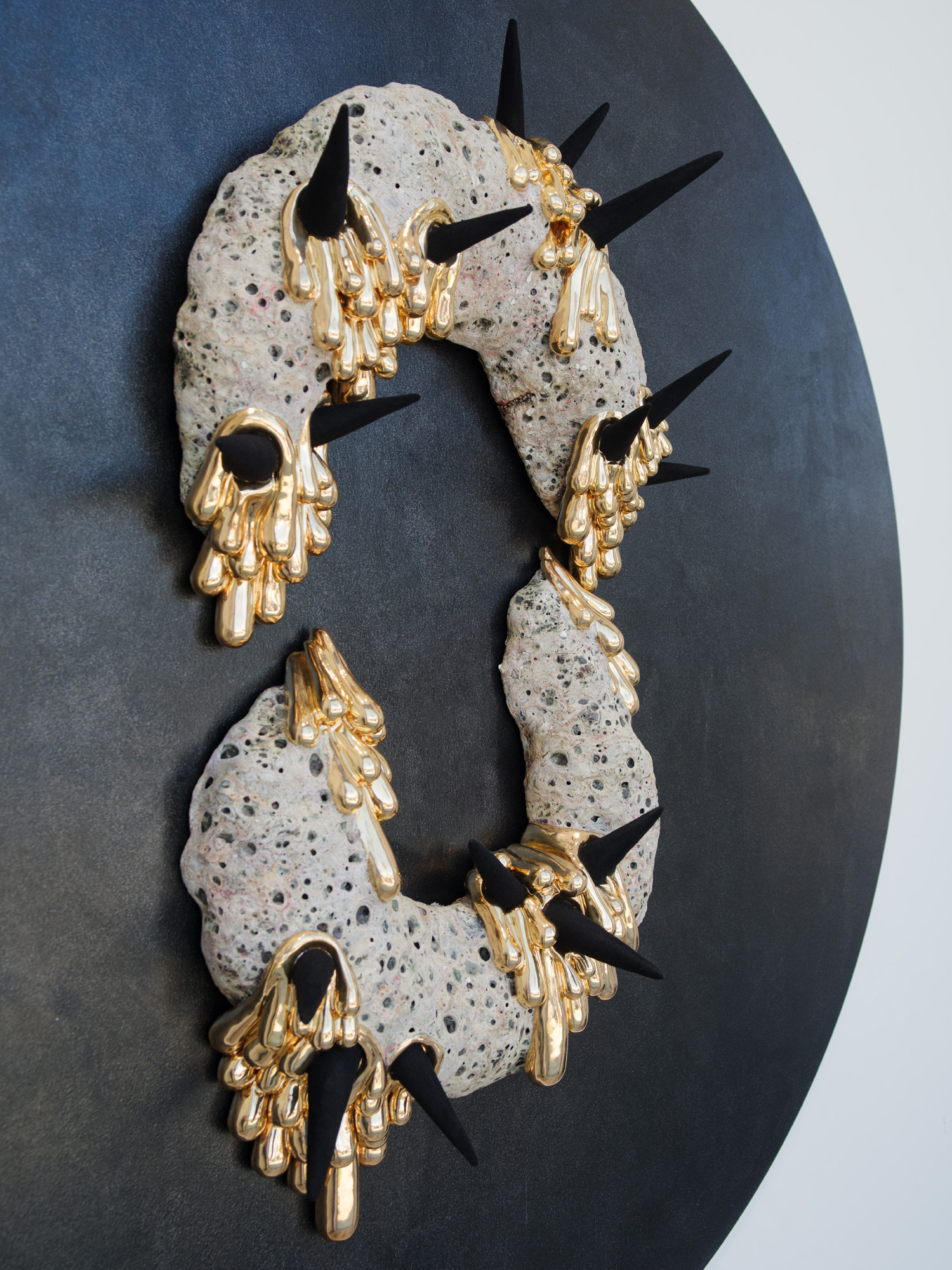 My practice is fundamentally rooted in an embrace of the unknown and reflection on transformation, using alchemic forms and surfaces to emphasize the shared materiality of our bodies, the earth and cosmos. These works shape-shift, oscillating between abstraction, flora, fauna and mineral. This has the effect of compressing time, with elements frozen in mid-transformation. This dislocation reflects on mortality and ephemerality, creating opportunities to psychically time travel to connect with eternities future and past.
