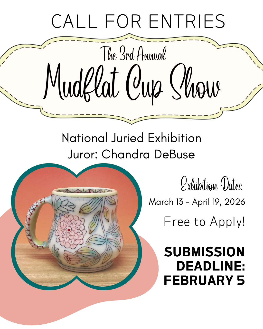 Calling All Ceramic Artists! Submit your functional cups & mugs to Mudflat’s 3rd Annual Cup Show! Juried by Chandra DeBuse, this national exhibition celebrates the art of the everyday vessel. Open to artists in the US and Canada. NO ENTRY FEE! Application due February 5th, 2026