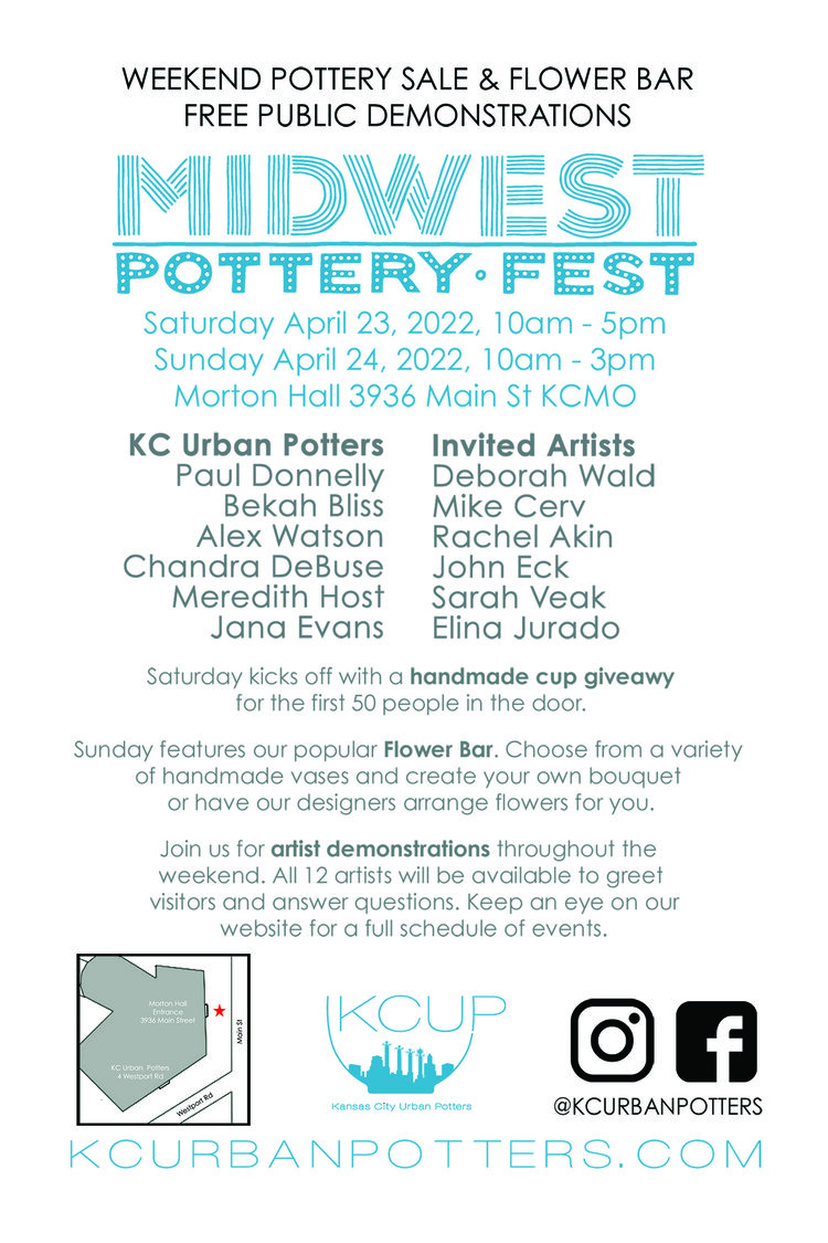 MIDWEST POTTERY FEST: APRIL 23 & 24th, 2022 – KC Urban Potters March 28, 2022 by Submission Form Join KC Urban Potters in Kansas City, MO for Midwest Pottery Fest!