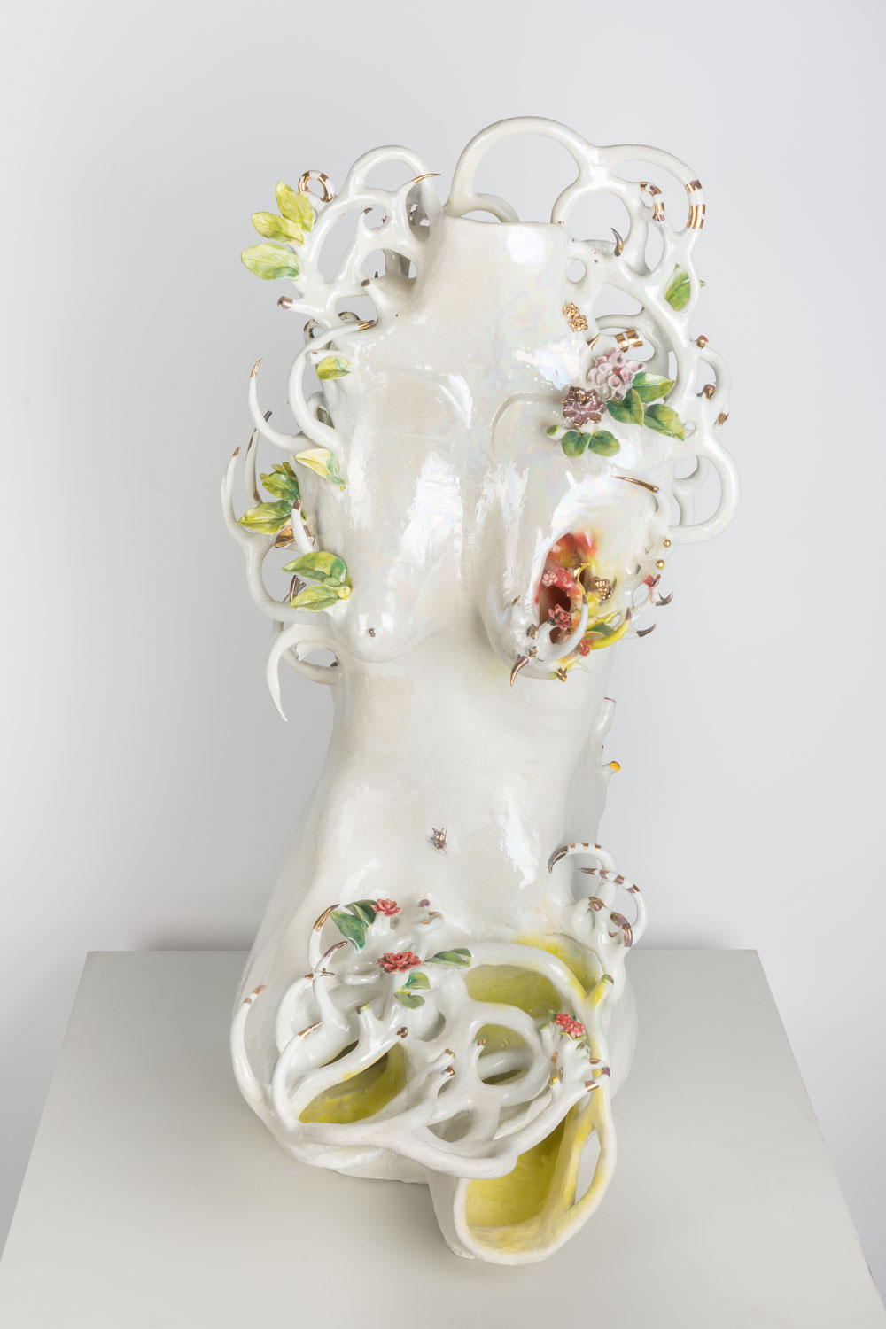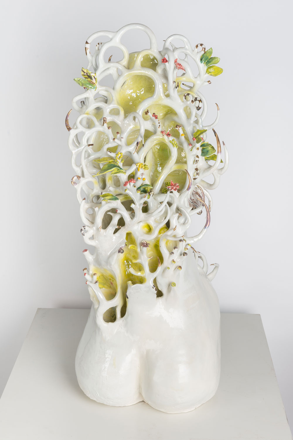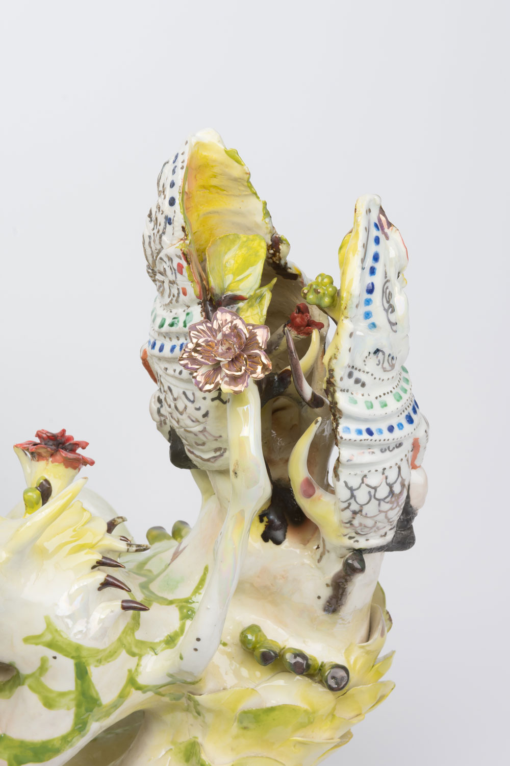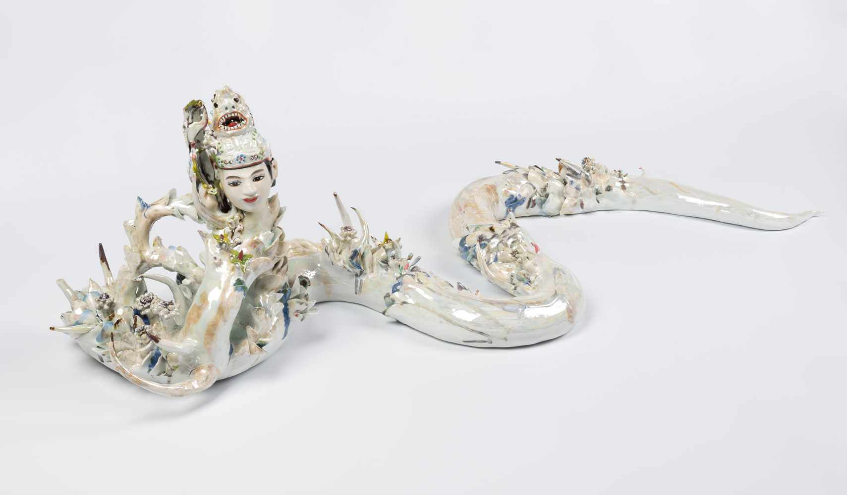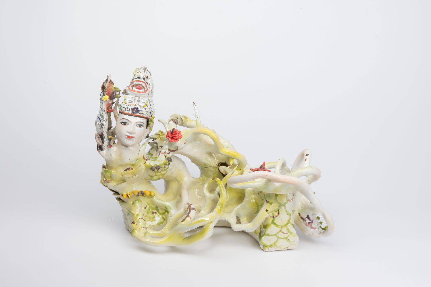 In my work, I explore different ways of expressing my experience of alienation, confusion and pain as a cultural outsider by creating narrative spaces that explore the lines between insides and outsides. Playing on the idea of the body being the house that shelter the spirit, I create work that is symbolic of the self. I instill the metaphorical sculptural self with a sense of organicity and intricacy by gesturing the bodily- the viscera and skeletal, morphing into the botanical to express the vitality, delicacy, and injury of the spirit inhabiting and animating the forms. As a third generation Chinese immigrant in Myanmar, I seek inspirations from cultural practices of ethnic Chinese and the local Burmese. Local animistic beliefs, folklores and mythologies inspire the imagery in my work. I am particularly interested in the female figures in Buddhist mythologies. In my most recent body of work, I explored creating hybrid bodies using imagery of Naga Maedaw, a dragon queen in Buddha’s birth stories, Jataka Tales. Art making, to me, is an ontological quest. I explore the nature of being by attempting to depict the ephemerality of the human condition. Condensation and displacement of violent desires, tender affections, spiritual hopes, sexual instincts and maternal conflicts are intimated with metaphors and symbols of nature’s cyclical growth, decay and death.Through exploring the otherness within the self, I hope to create enigmatic bodies, comprised of poetic spaces dwelled by the liminal self, fragmented and dislocated, in search and in transition, captured in a moment of growth and transformation.